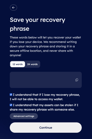 - Securely backup your mnemonic seed phrase. Also make sure to accept the Terms and Conditions as shown below.