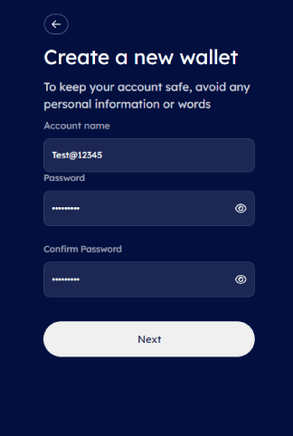 - Set a password for your account and give it a name. The next time you wish to use the wallet or make significant changes to your account, this password will be required. Click here for More Details