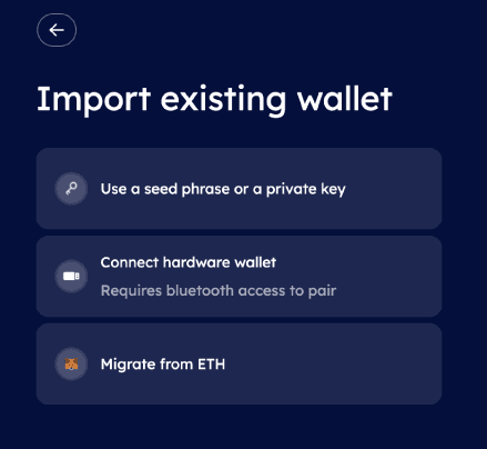 By choosing this option, you will need to choose among 3 different option to import an existing wallet.