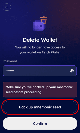 User can also backup their mnemonic seed of account before deleting it by clicking on Back up mnemonic seed.